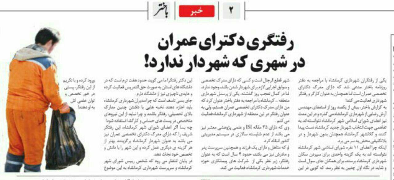 اندیشه قصرشیرین " یکی از رفتگران شهرداری کرمانشاه با مراجعه به دفتر روزنامه باختر مدعی شد که دارای مدرک دکترای تخصصی عمران است اما همچنان به عنوان کارگر و رفتگر شهرداری فعالیت می کند!